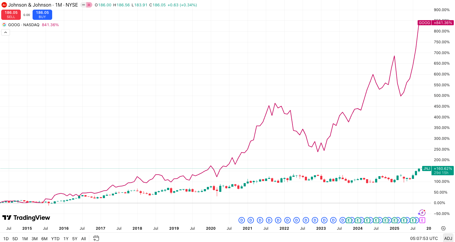 Chart of GOOG vs JNJ (Volatility vs steady growth)