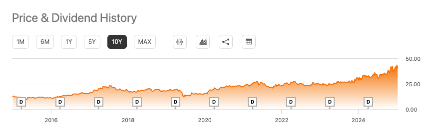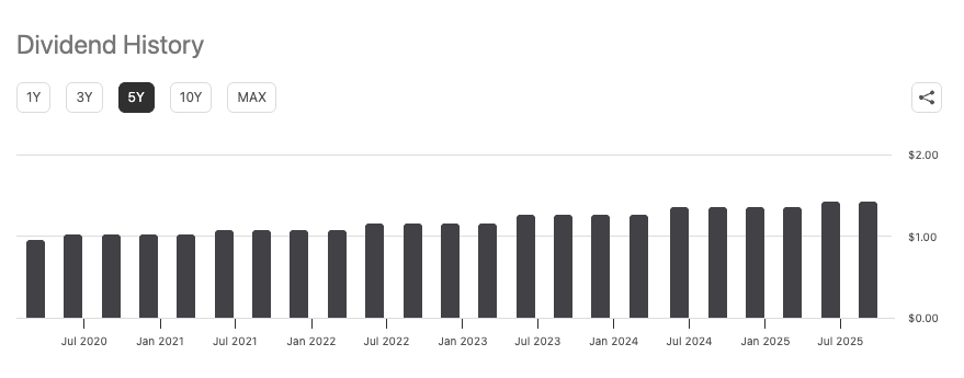 A consistent track record of raising the dividend per share (DPS) is rarely found in cyclical or fragile businesses. It often points to companies with strong pricing power, wide moats, and well-managed capital allocation—traits that allow them to continue paying and even growing dividends during recessions, inflationary periods, or sector-specific downturns.