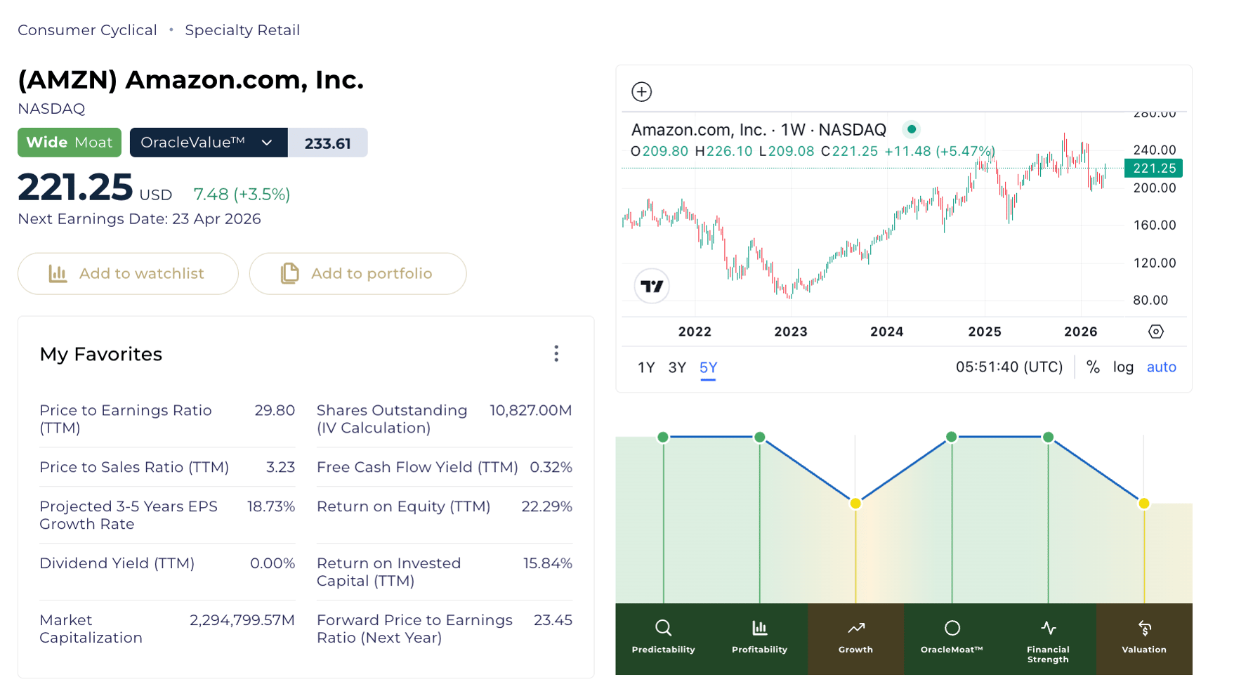 Amazon trades at roughly $220 per share with a market cap of approximately $2.29 trillion, a trailing P/E of around 29, a forward P/E of roughly 24, and a price-to-sales ratio of 3.23.
