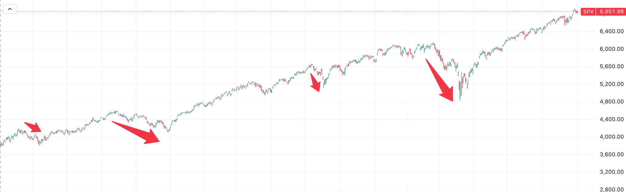 Chart of the S&P 500 from Jan 2023 to Nov 2025, highlighting several major downturns and minor pullbacks.