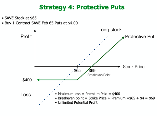 In the example, the Option Trader bought SAVE stock at $65 and buys a 65 strike put for $4 (or $400 per contract).