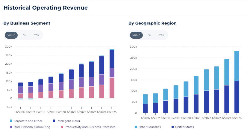 Microsoft operates across three core segments. Productivity and Business Processes includes Office, Microsoft 365, LinkedIn, and Dynamics. Intelligent Cloud, led by Azure, is its main growth engine as cloud and AI adoption scale. More Personal Computing spans Windows, devices, Xbox, and search, anchoring Microsoft in consumer and hardware-linked revenue.