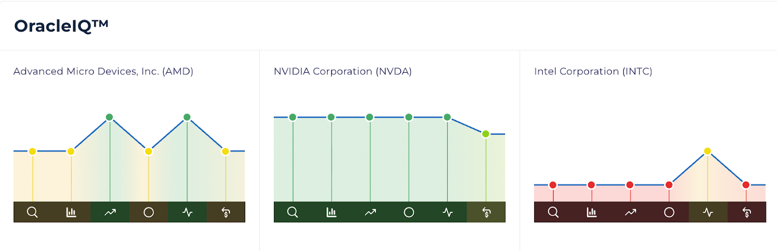 As custom silicon and alternatives from AMD and Intel gain traction, OracleIQ™ provides a clear comparison of the competitive landscape. OracleIQ™ positions NVIDIA (NVDA) as the clear leader over AMD, with consistently higher scores in predictability, profitability, moat, and financial strength. NVDA’s dominance reflects its leadership in AI accelerators, superior margins, and highly visible revenue streams, supporting strong execution confidence.