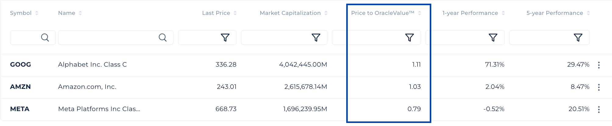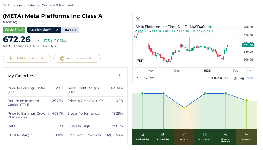 Meta stands out on estimated valuation: with a price-to-OracleValue™ of 0.79, it screens meaningfully cheaper than Google (1.08) and Amazon (1.01), even though it continues to post healthy earnings growth and strong medium-term performance. Meta appears more conservatively valued than its closest advertising and platform peers.