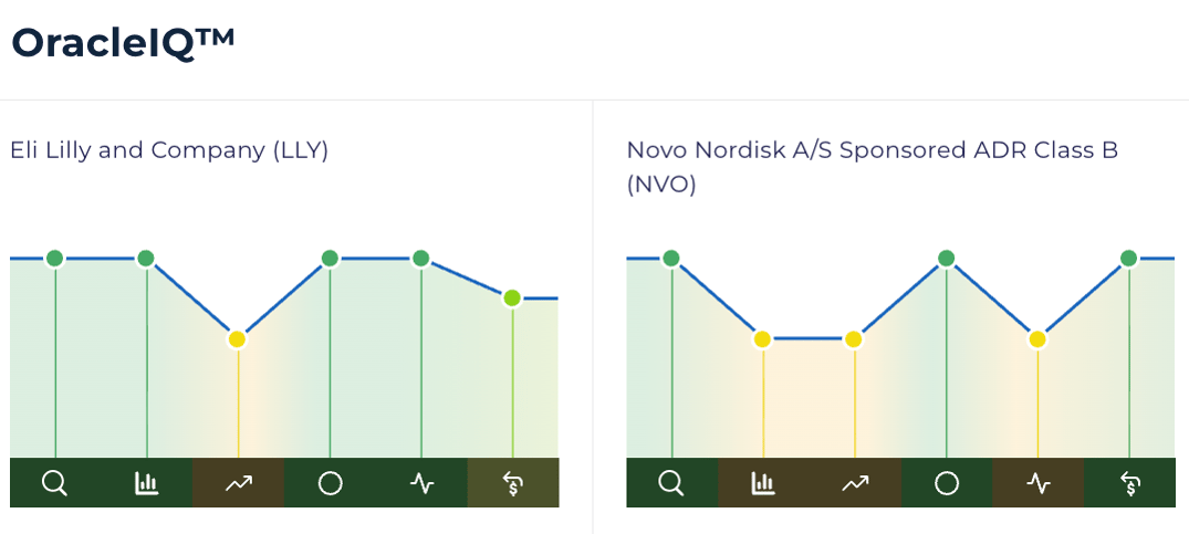 OracleIQ™ of LLY and NVO key difference lies in financial strength, where LLY appears more stable and resilient with relatively better cash flow dynamics, while NVO remains solid but slightly more sensitive.