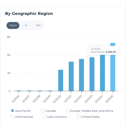 Netflix’s expansion into Asia-Pacific has become one of its most important growth engines. Revenue from the region has risen steadily since 2020, reflecting successful localization strategies.