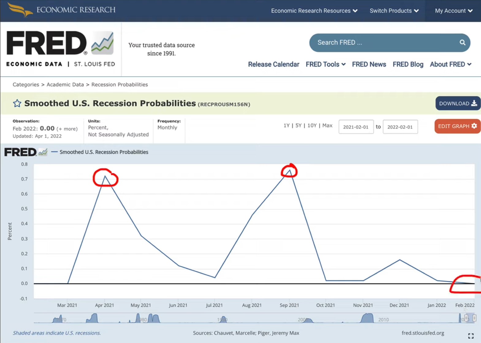 So have we passed 20%? No, in fact, you can see in April 2021 the probability of a recession from the FED itself was 0.7%. in august or September 2021 it went up 2.8%, and the latest in February 2022, the